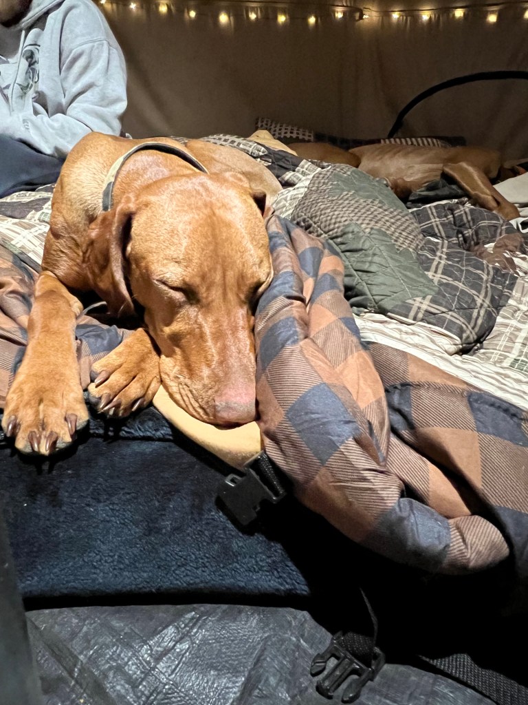Optional: A collar light. These things are extremely helpful for the darkness that comes with camping outside of light pollution. If you have an extra headlamp, turn the green or red light on and place that on your dog instead.